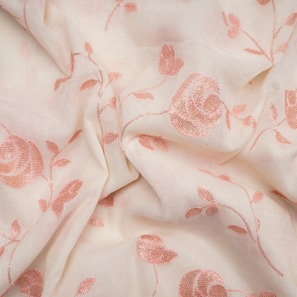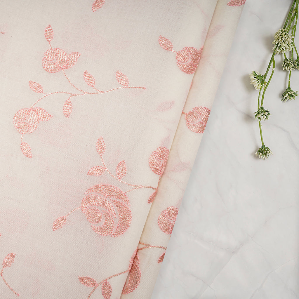 (Pre-Cut 0.80 Mtr) Off-White Dyeable Pink Floral Pattern Thread Embroidered Cotton Fabric