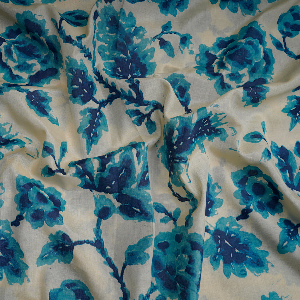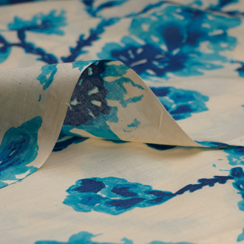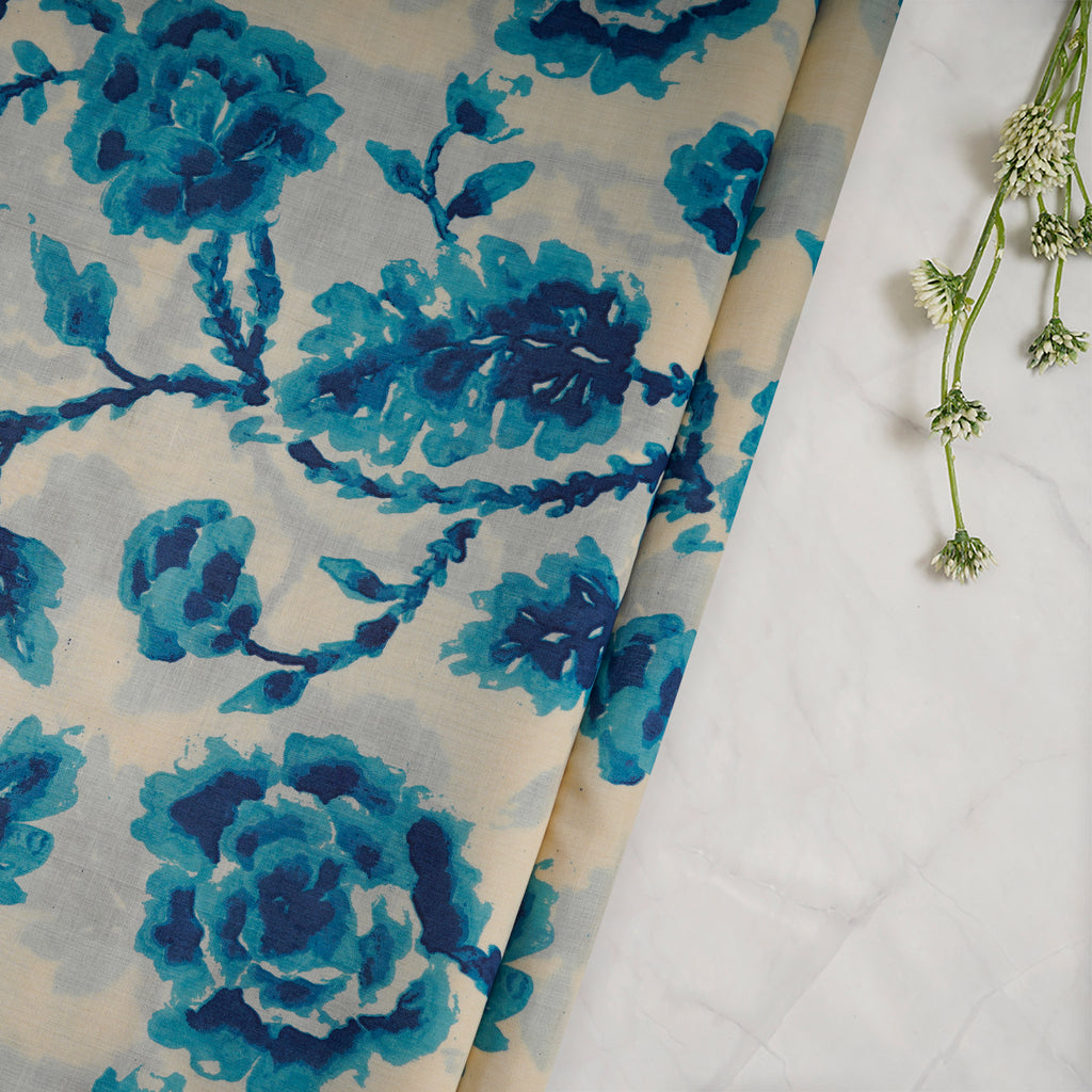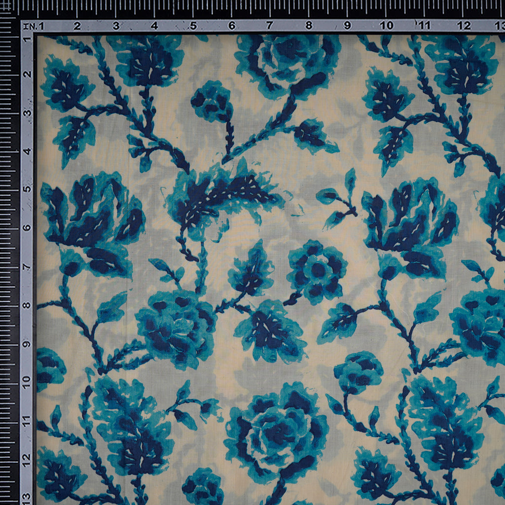 (Pre-Cut 1.00 Mtr)Cream-Blue Color Digital Printed Tussar Chanderi Fabric