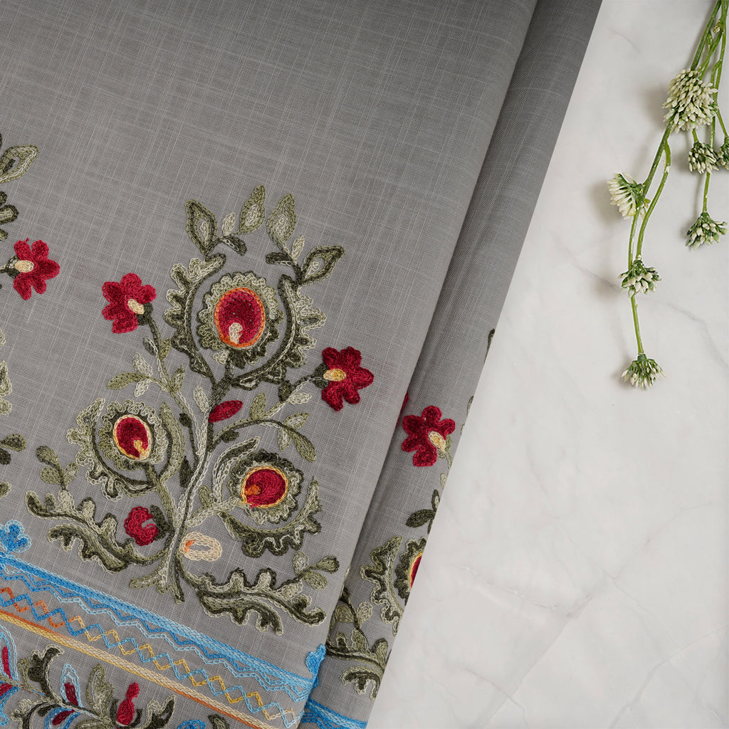 (Pre-Cut 1.00 Mtr)Multi Color Embroidered Cotton Fabric