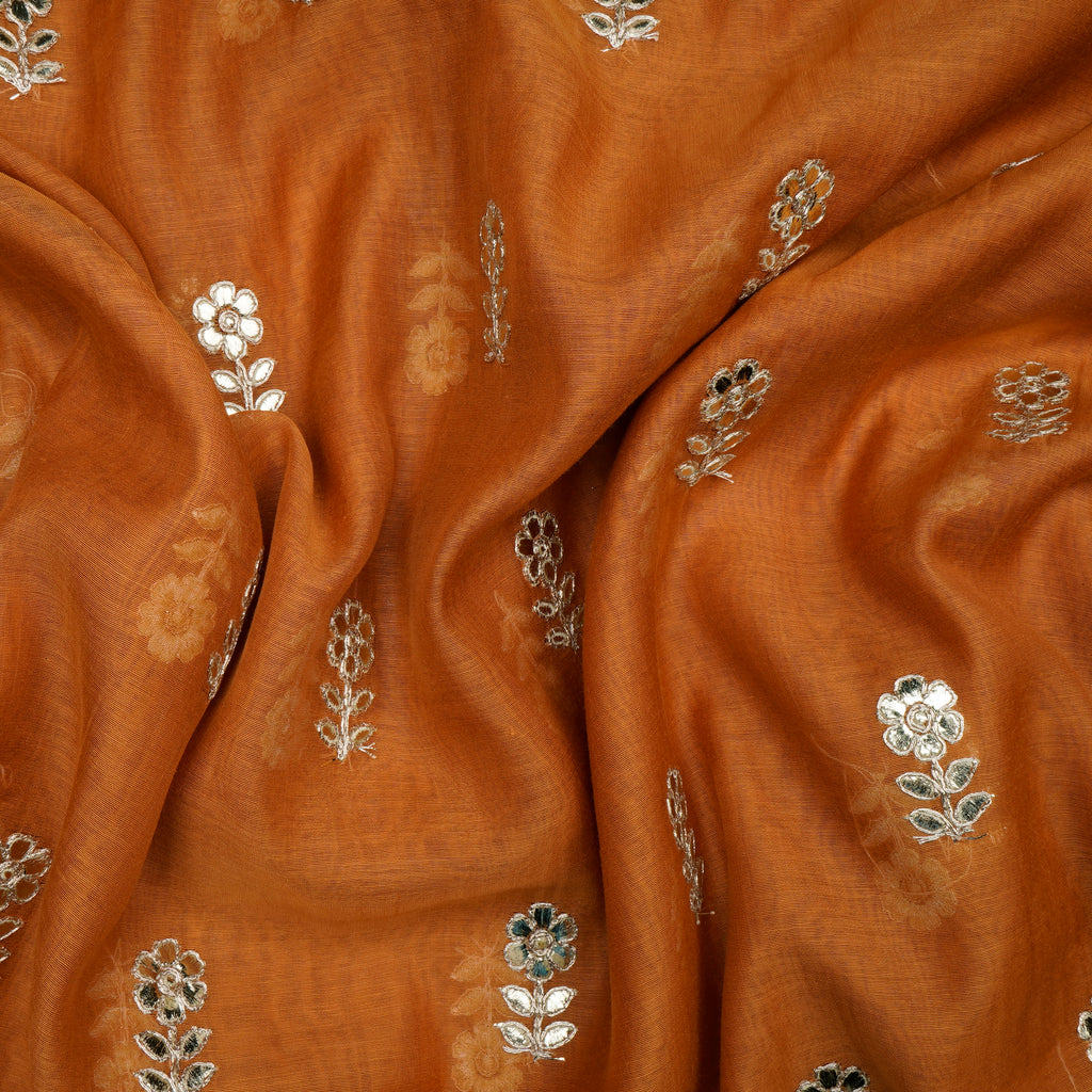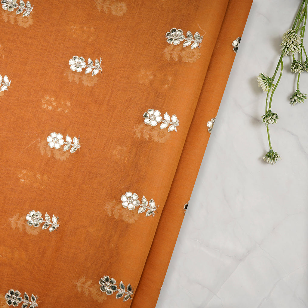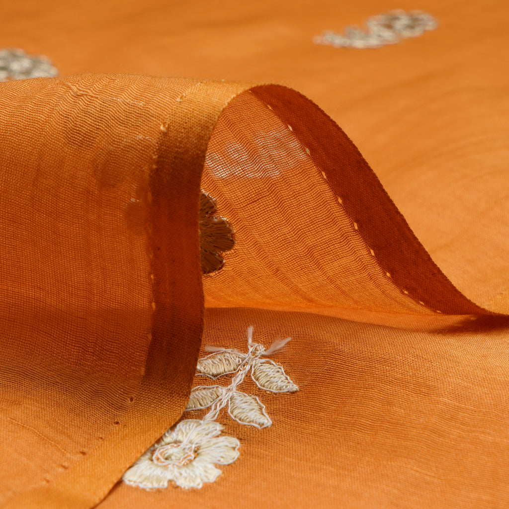 (Pre-Cut 1.00 Mtr)Mustard Motif Pattern Thread Embroidered Chanderi Fabric
