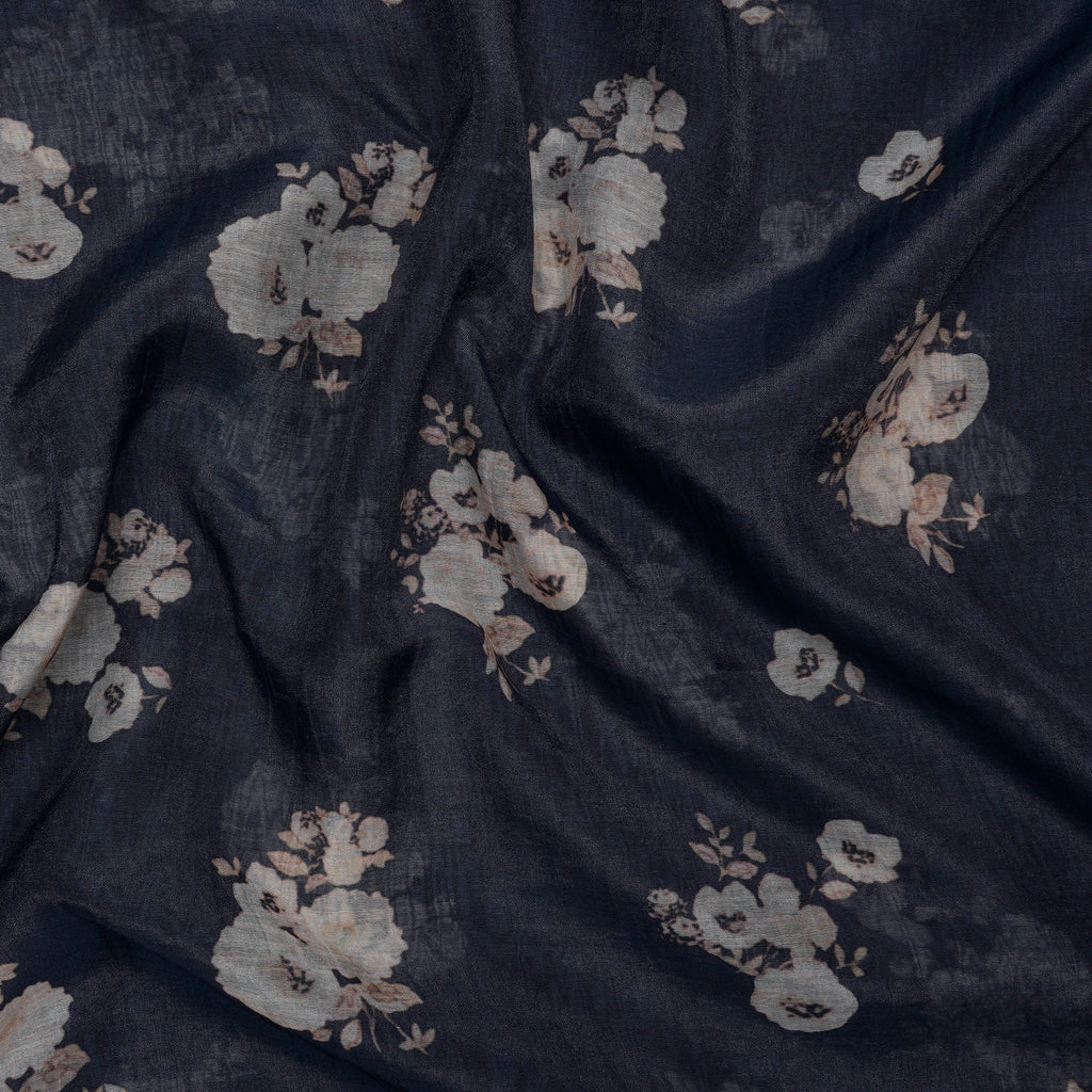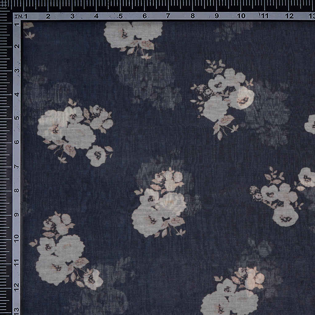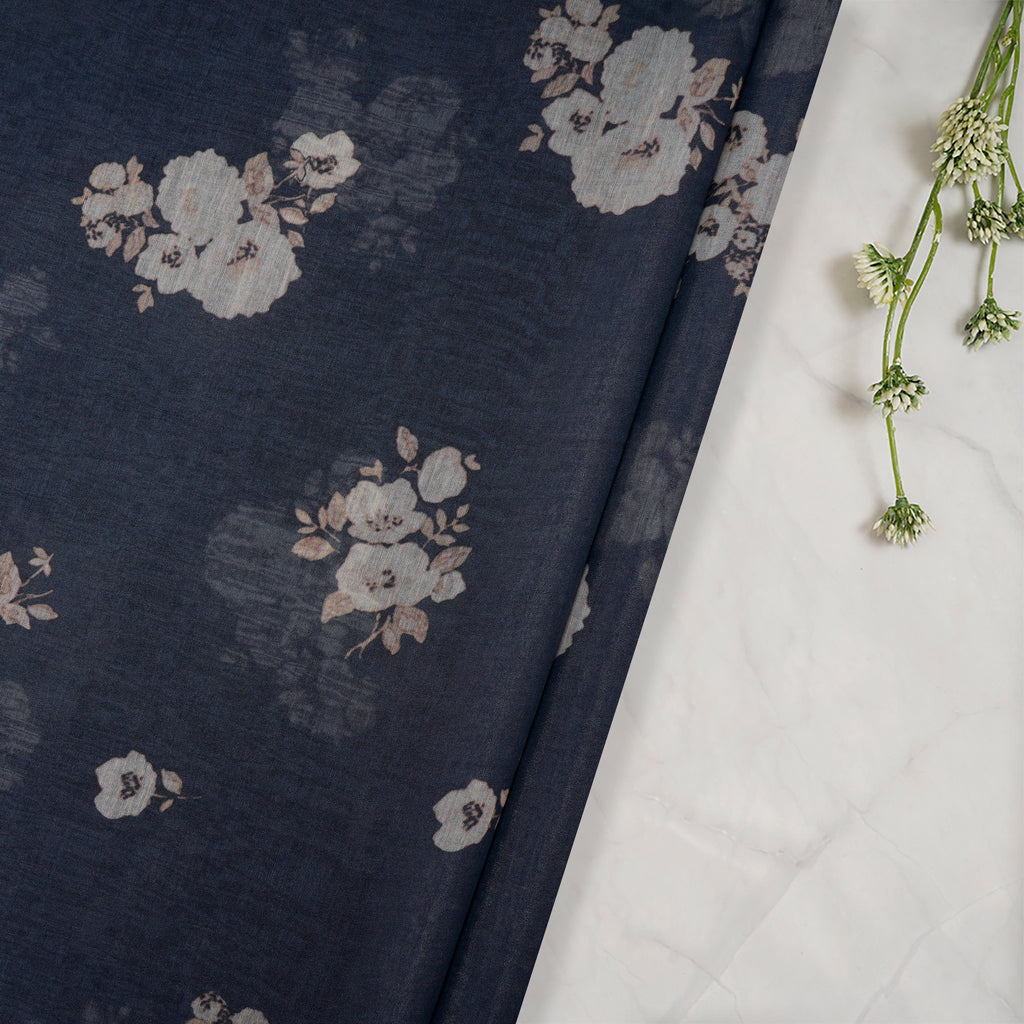(Pre-Cut 1.00 Mtr)Navy Blue Floral Pattern Digital Print Pure Fine Chanderi Fabric