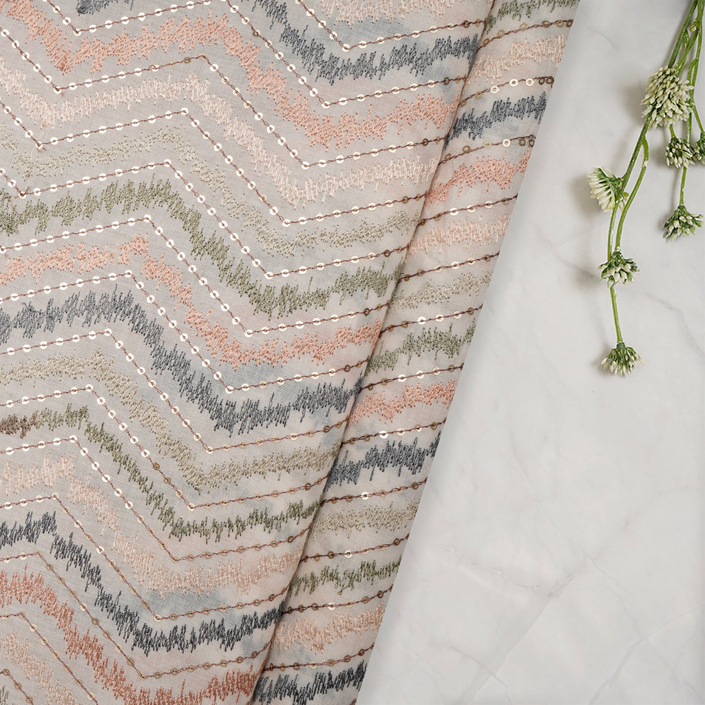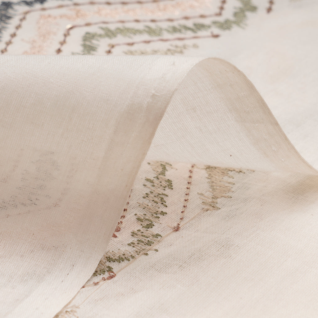 (Pre-Cut 1.40 Mtr)Cream Base with Multi Thread Geometric Pattern Embroidered Cotton Fabric