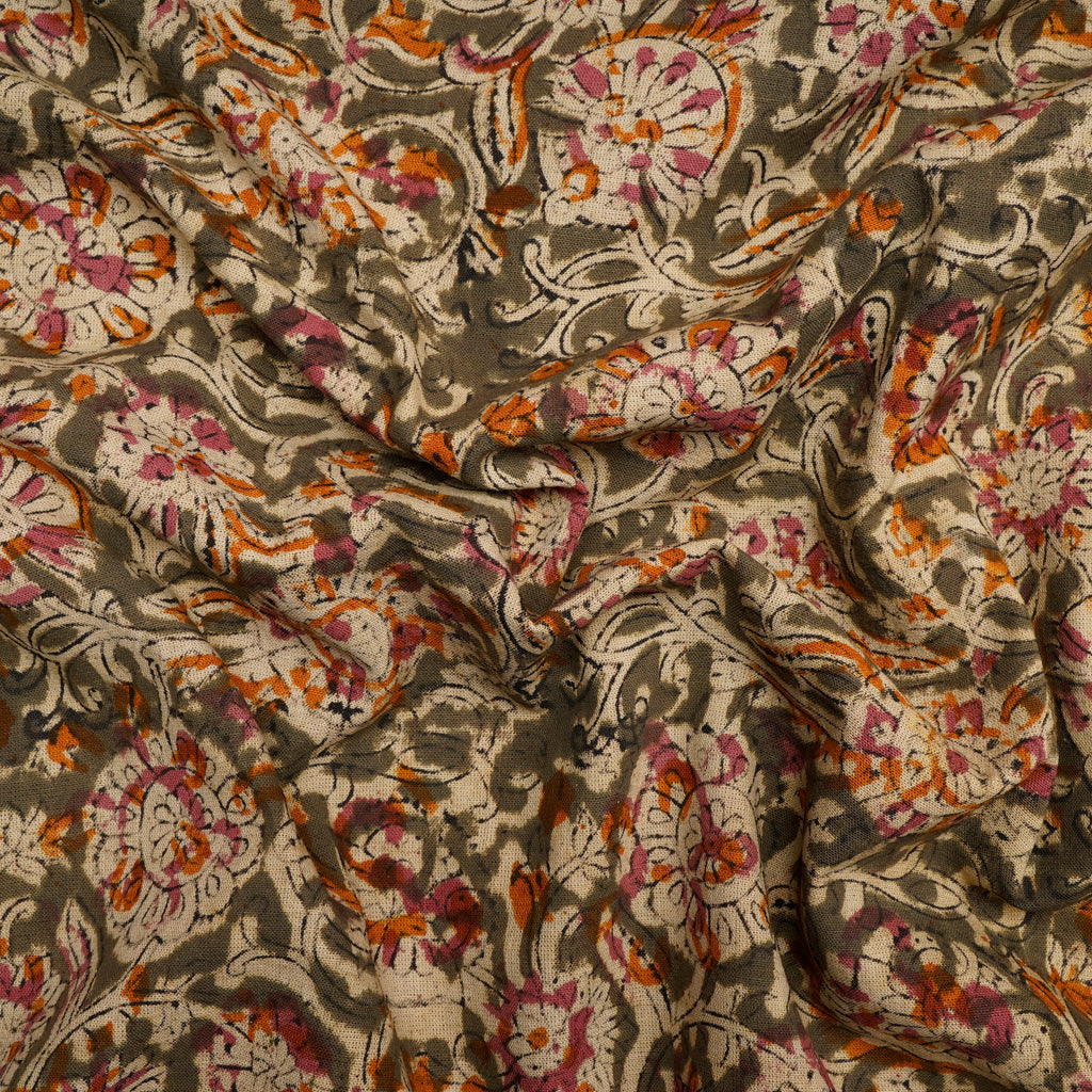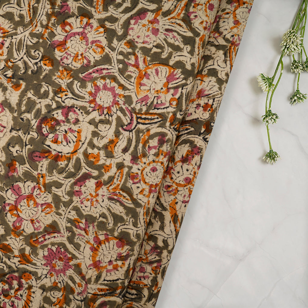 (Pre-Cut 1.40 Mtr)Multi Color Floral Pattern Hand Block Kalamkari Printed Cotton Fabric