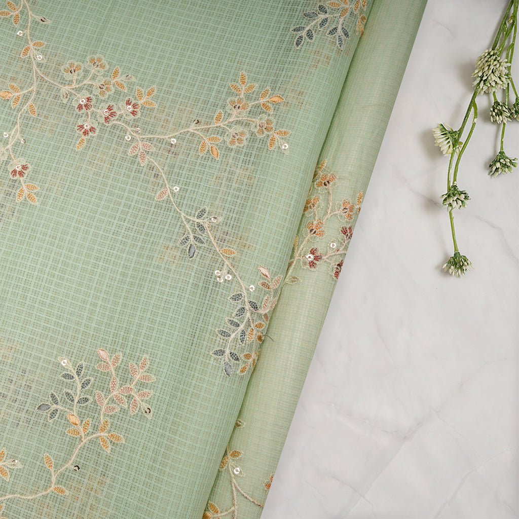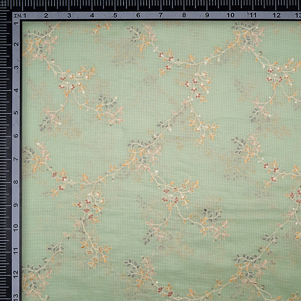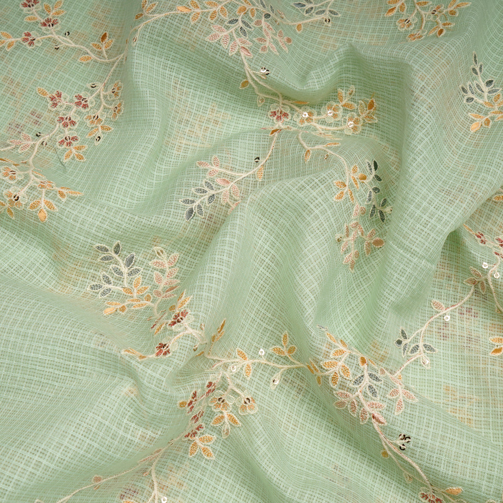 (Pre-Cut 1.50 Mtr)Pastel Green All Over Pattern Thread & Sequin Embroidered Cotton Kota Fabric