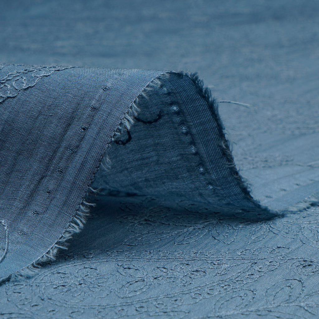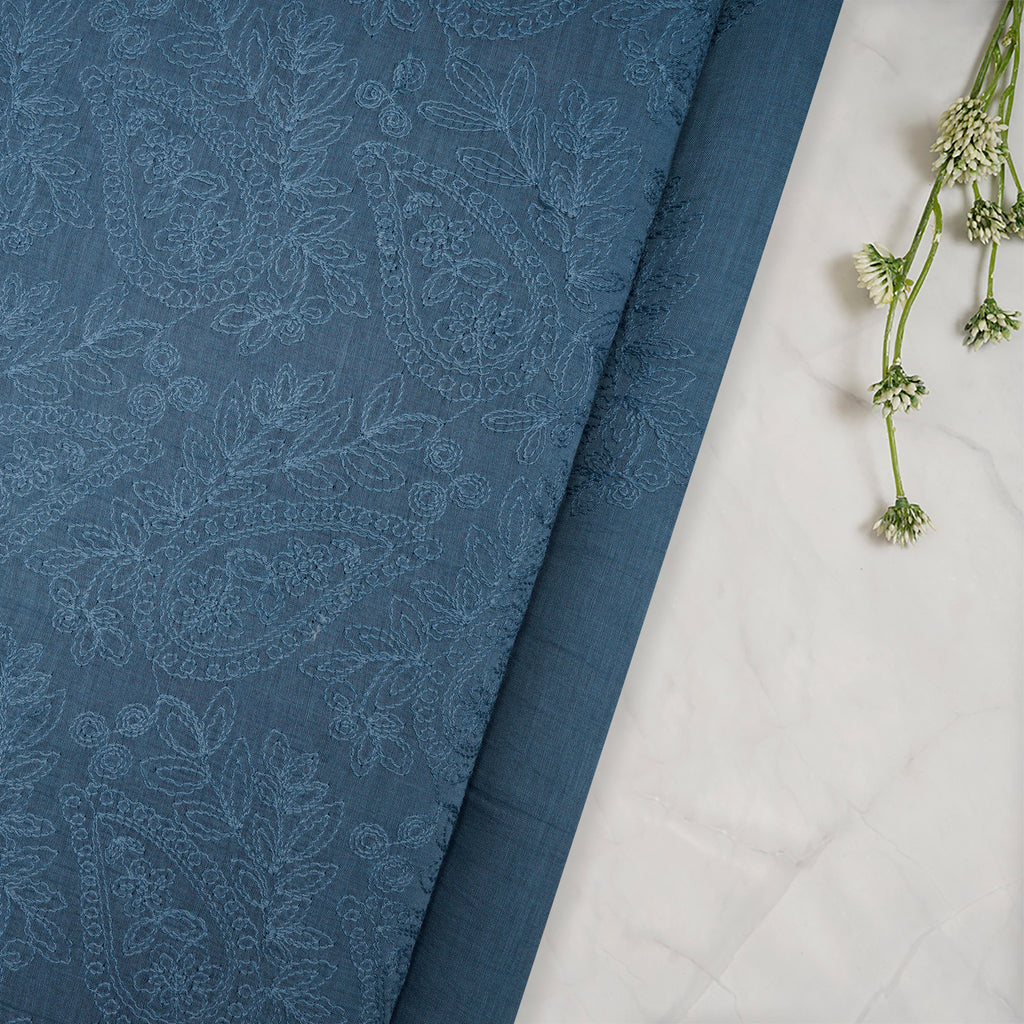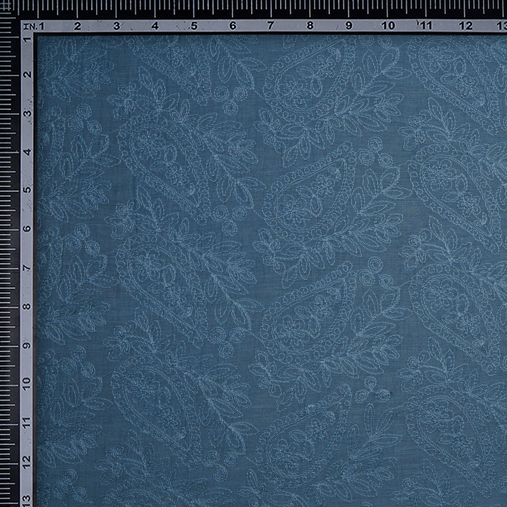 (Pre-Cut 2.20 Mtr)Stone Blue Paisely Pattern Embroidered Fine Chanderi Fabric