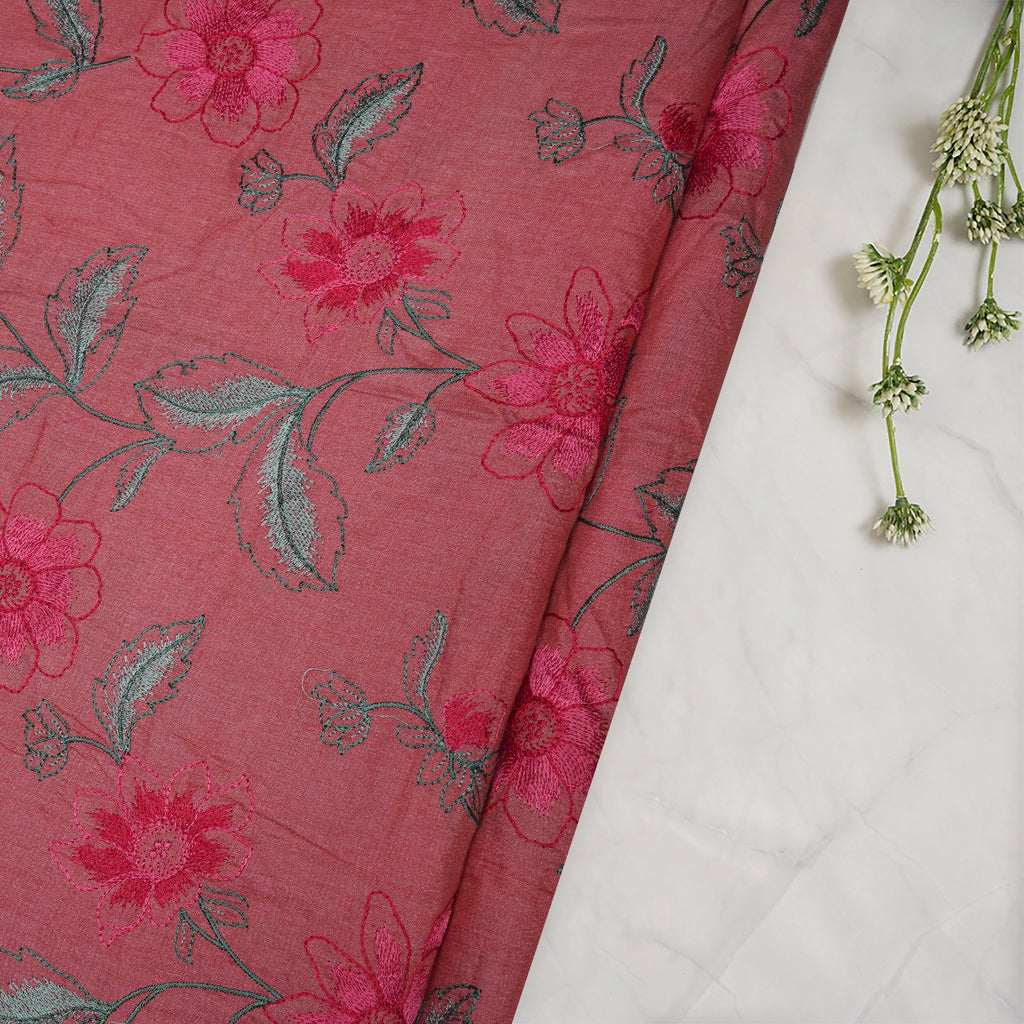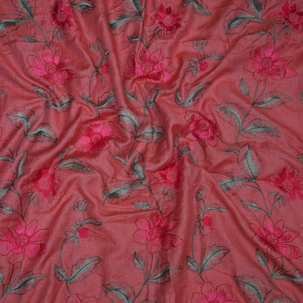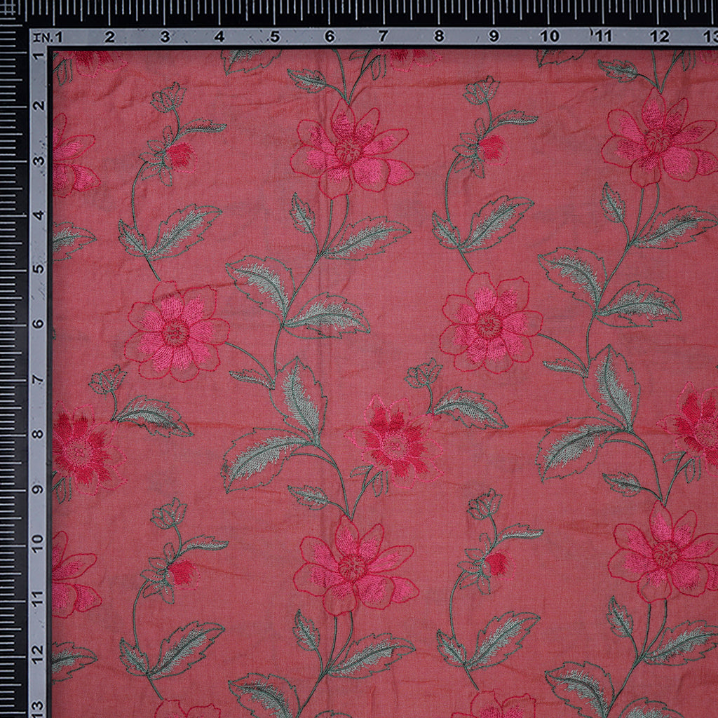 (Pre-Cut 2.70 Mtr)Salmon Color Embroidered Tussar Muga Silk Fabric