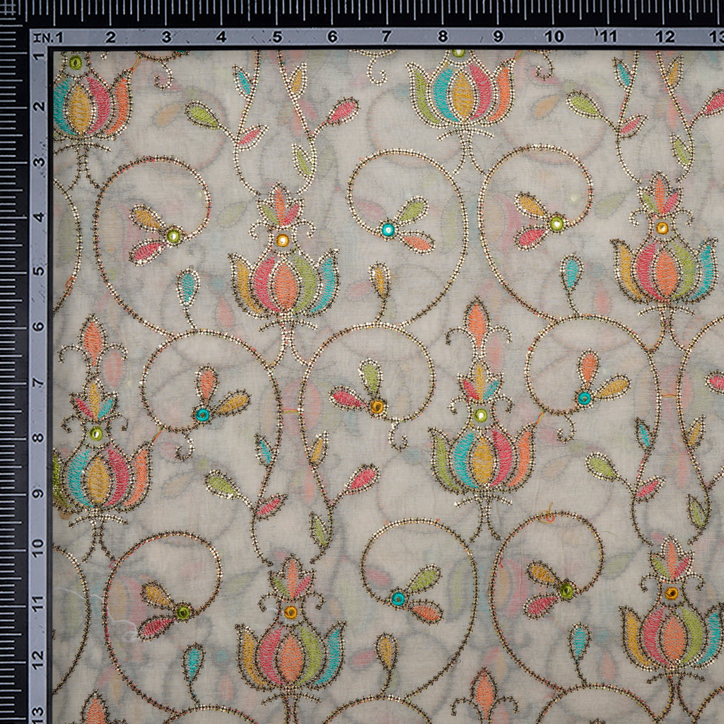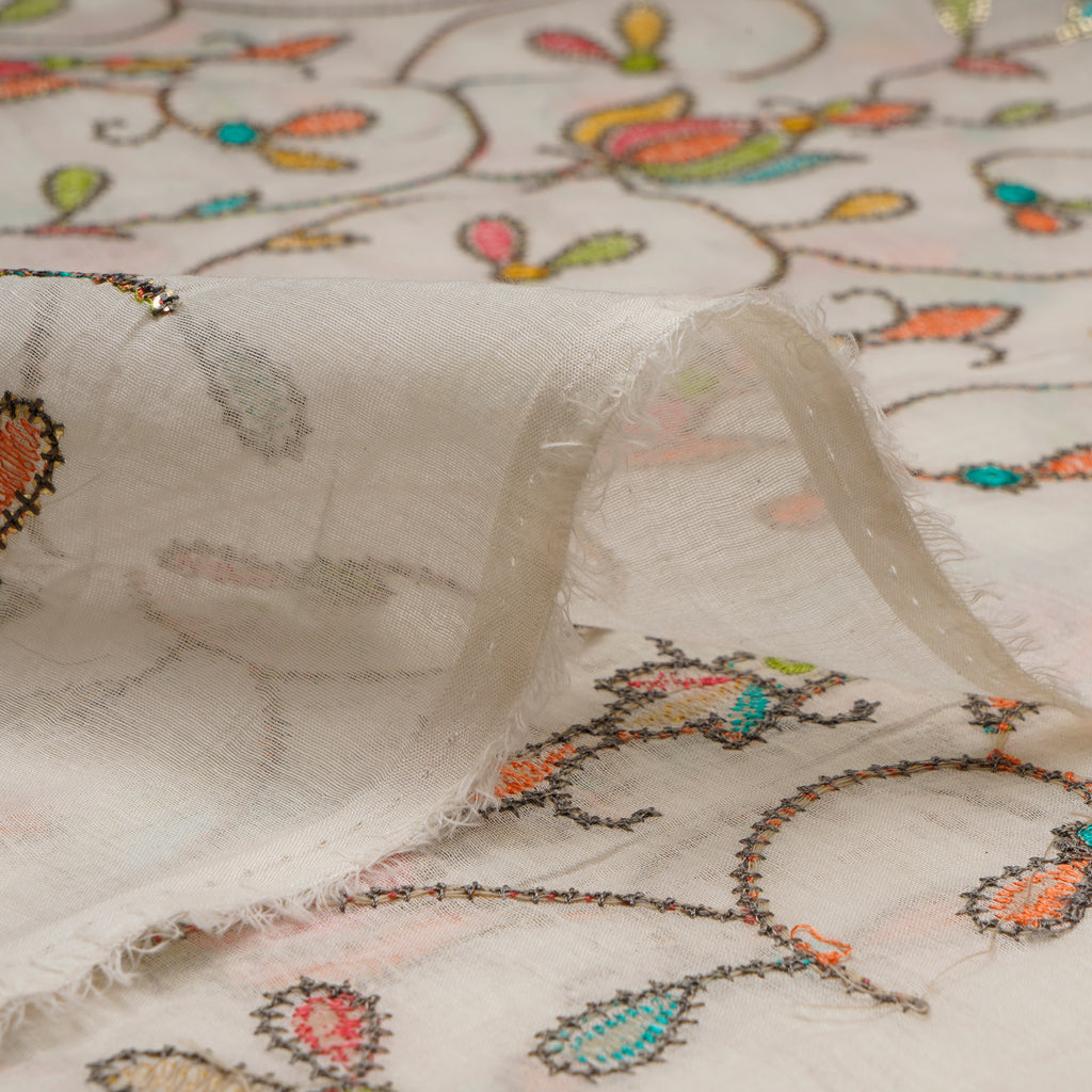 (Pre-Cut 2.80 Mtr)Off White with Multi Color All Over Pattern Embroidered Chanderi Fabric