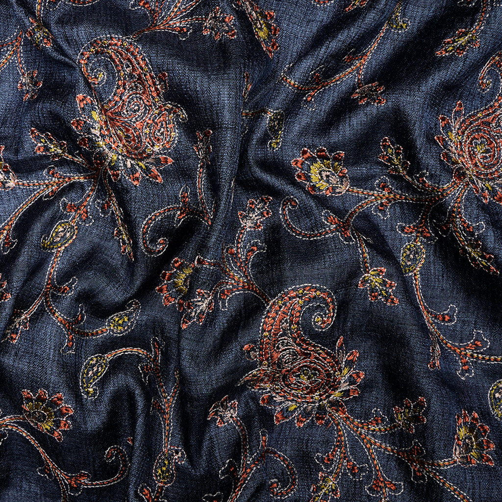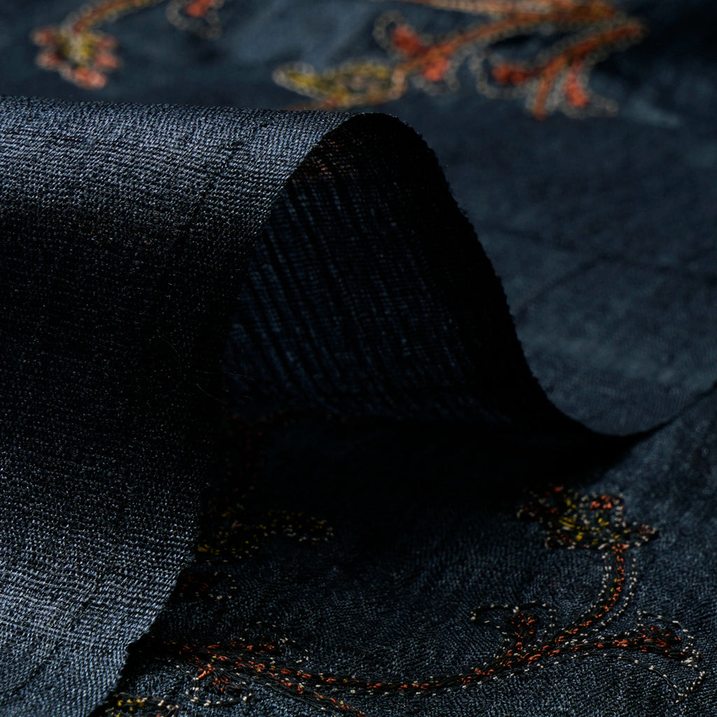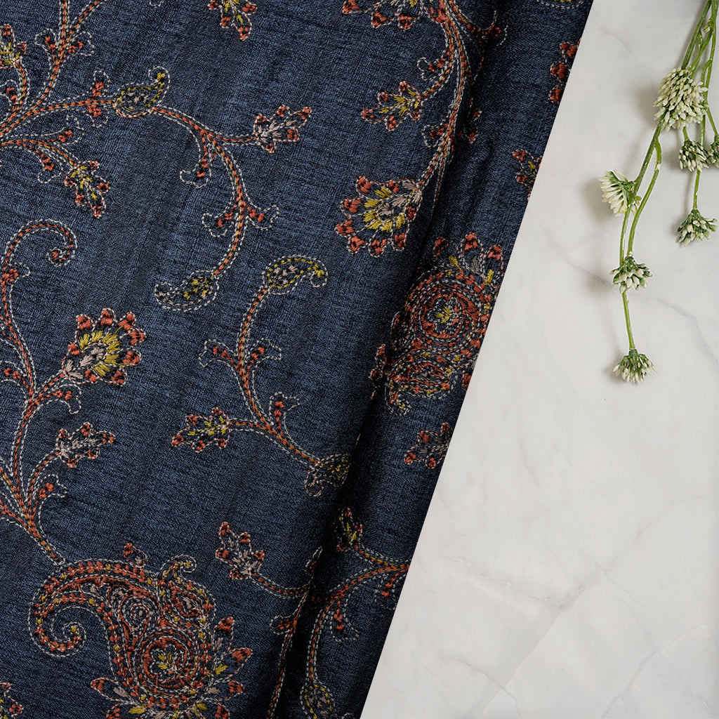 (Pre-Cut 3.00 Mtr)Navy Color Embroidered Tussar Silk Fabric