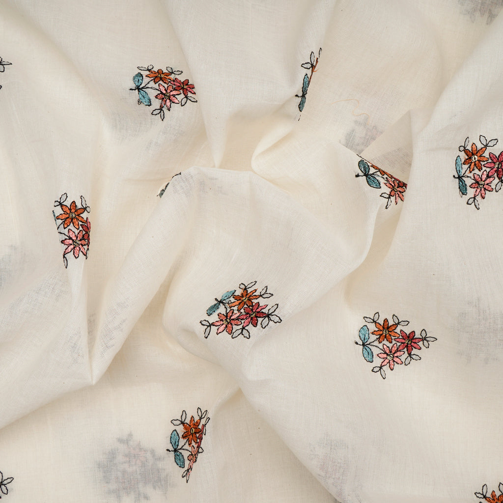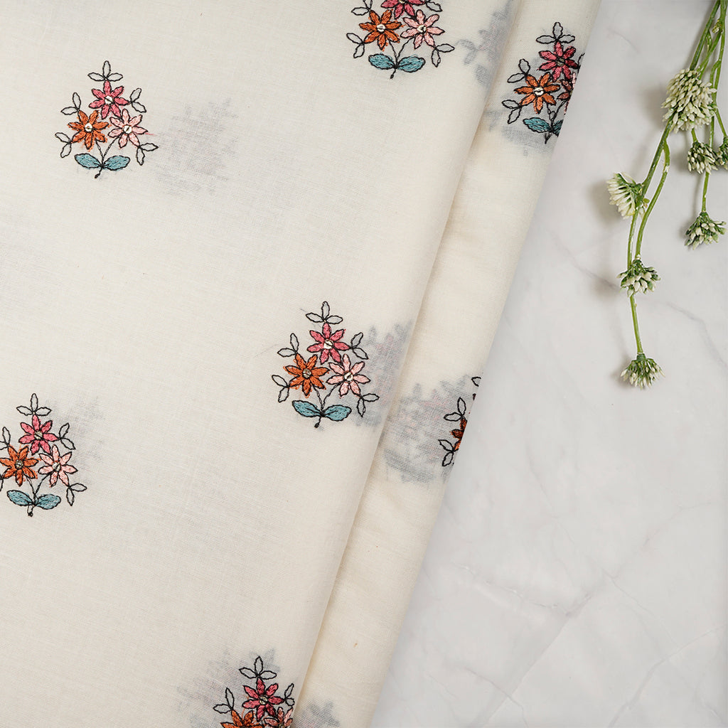 (Pre-Cut 3.30 Mtr)Off-White Motif Pattern Thread Embroidered Cotton Fabric