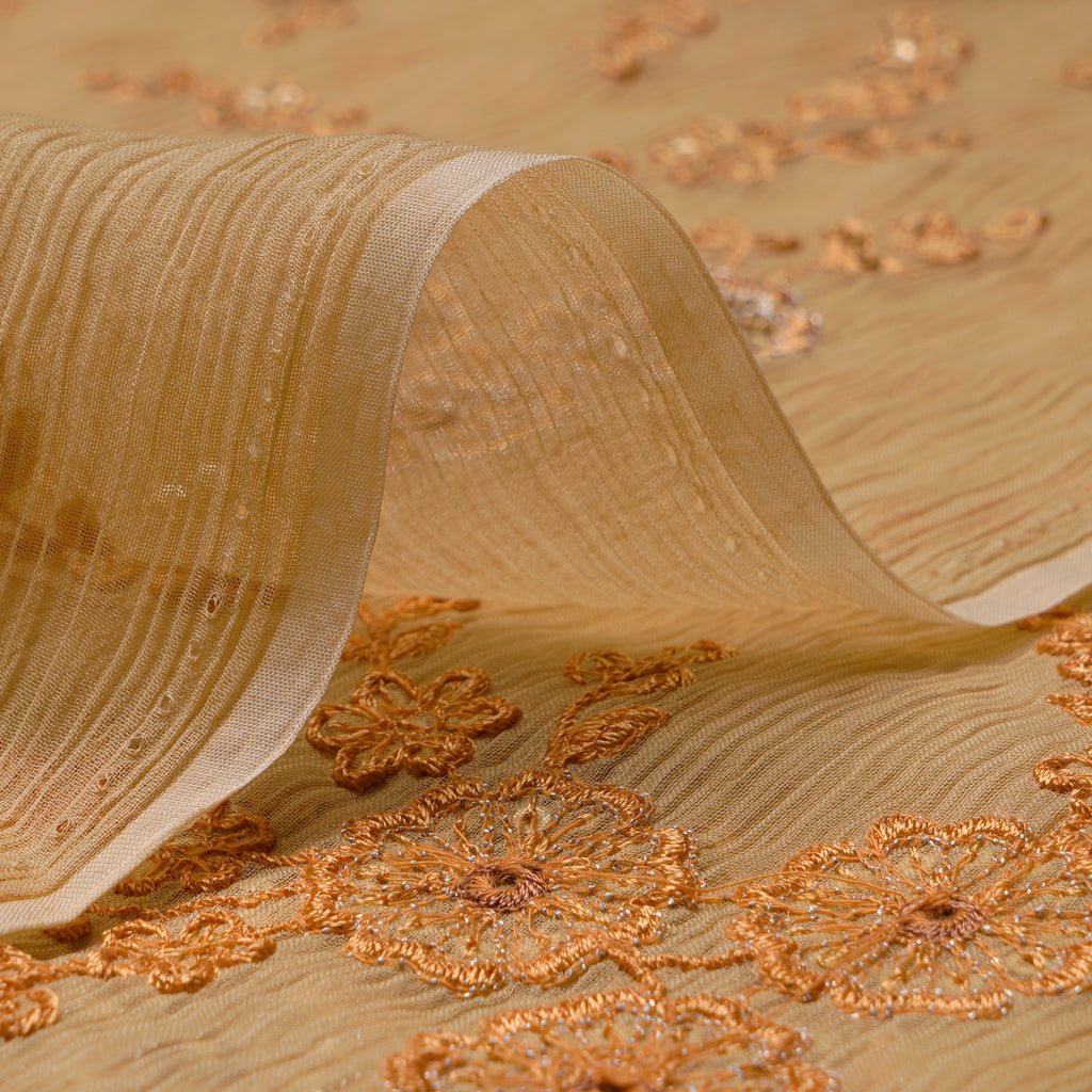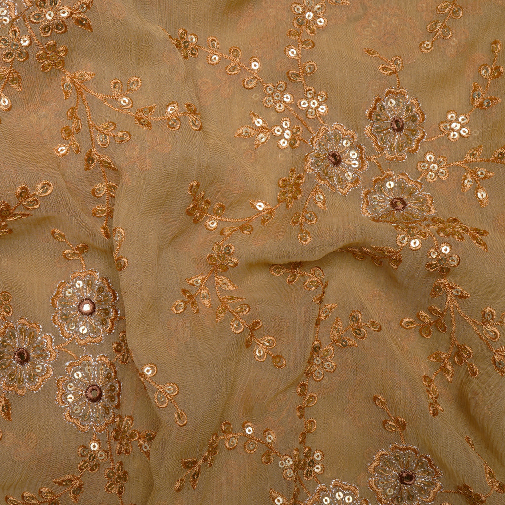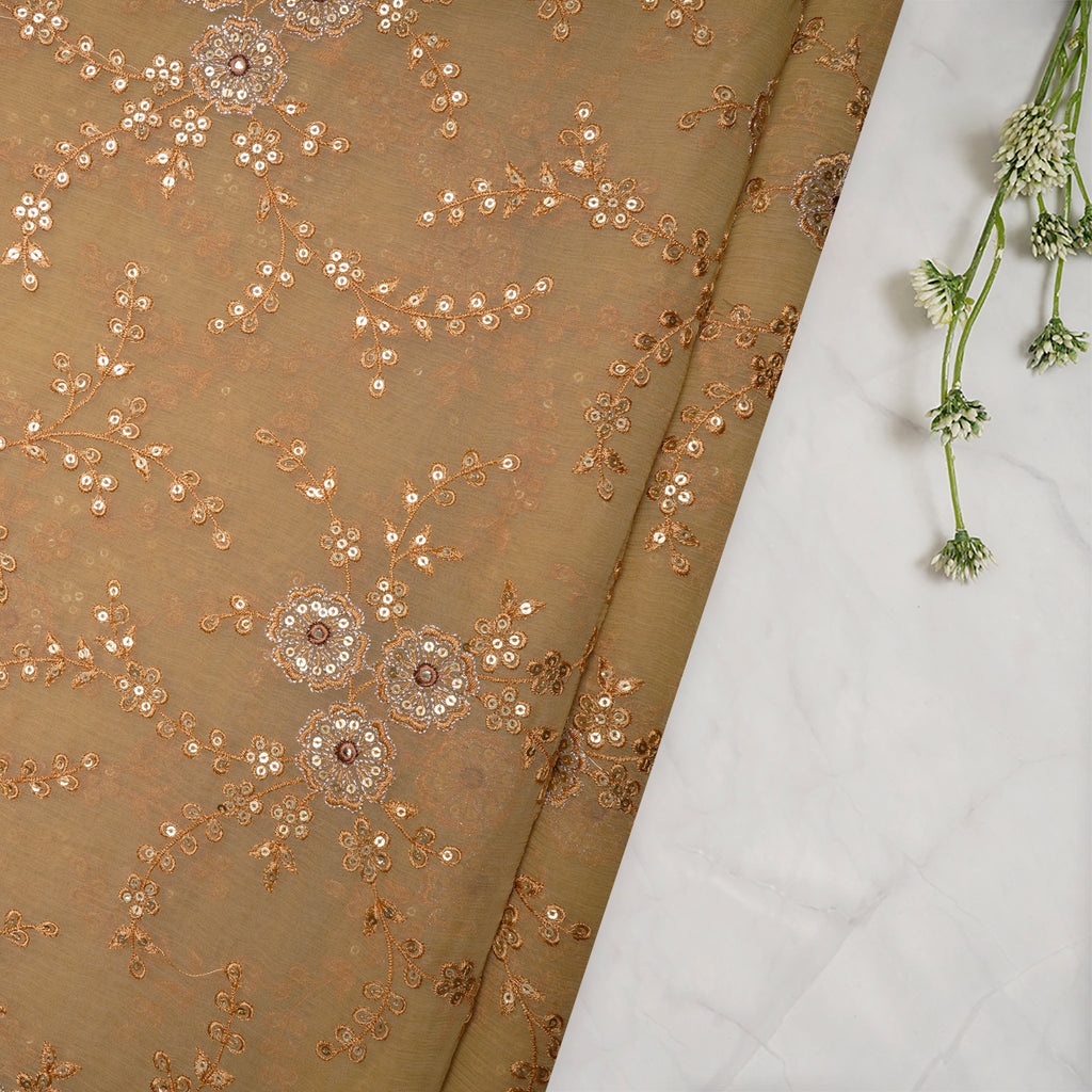 (Pre-Cut 3.60 Mtr)Cream Floral Pattern Thread Sequins Embroidered Bemberg Chiffon Fabric