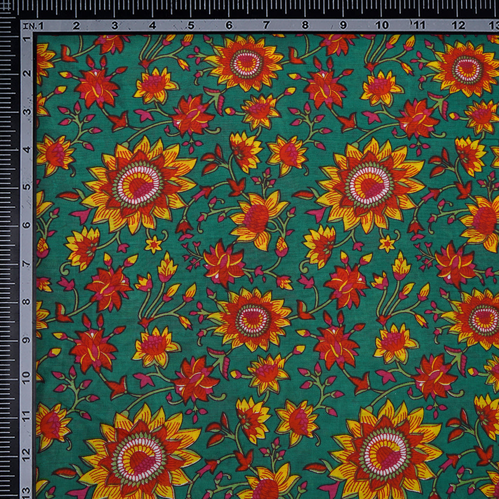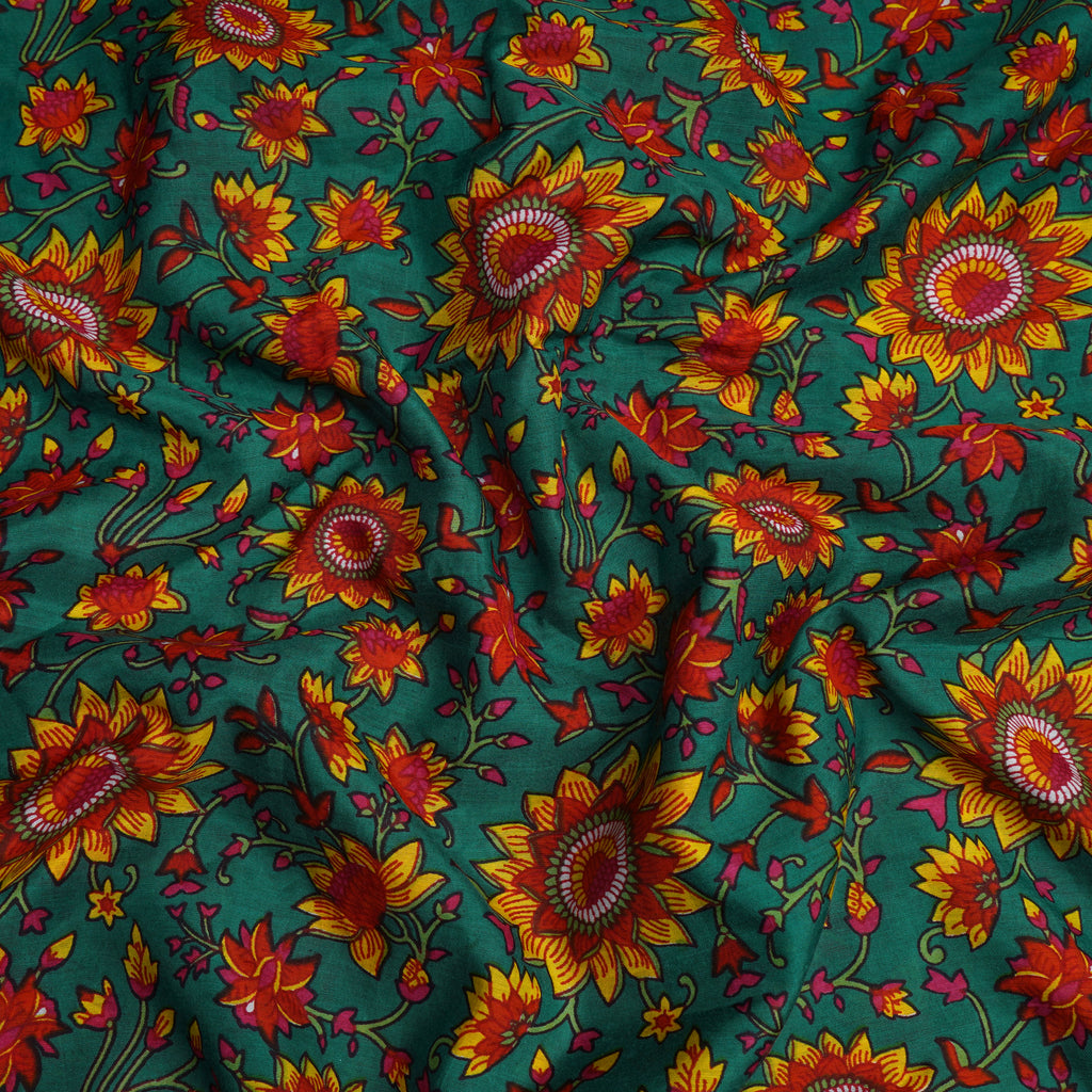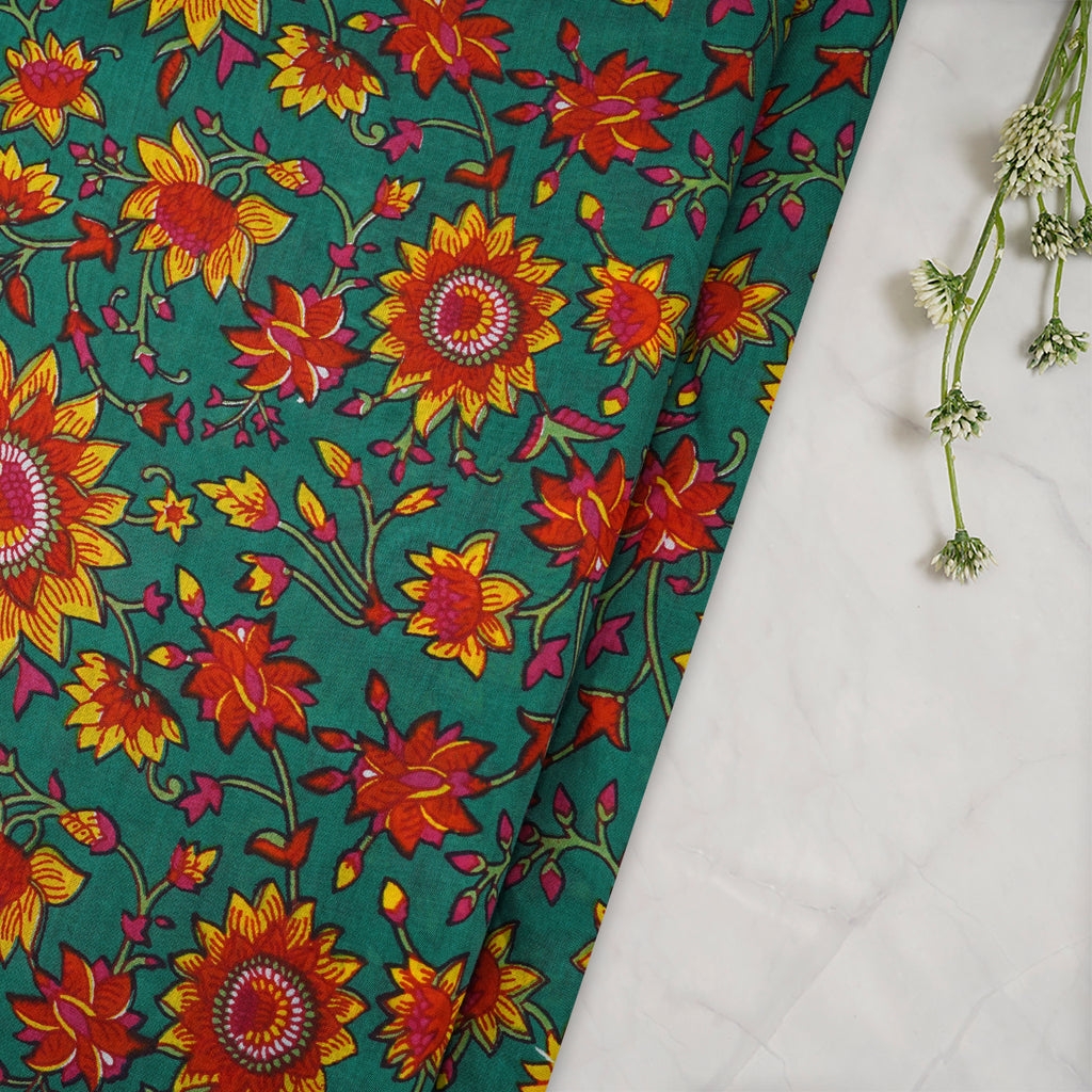 (Pre-Cut 4.20 Mtr)Green-Red Color Printed Bemberg Modal Fabric