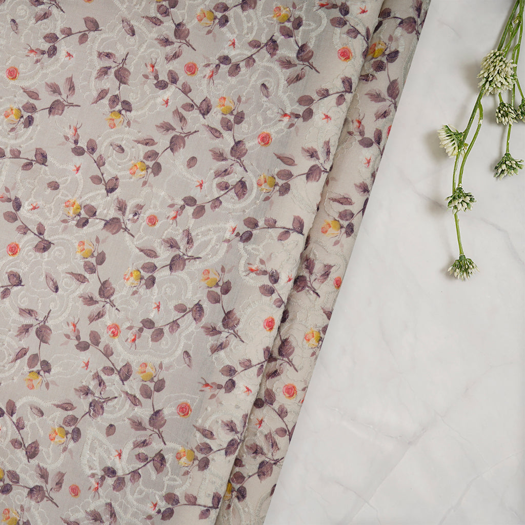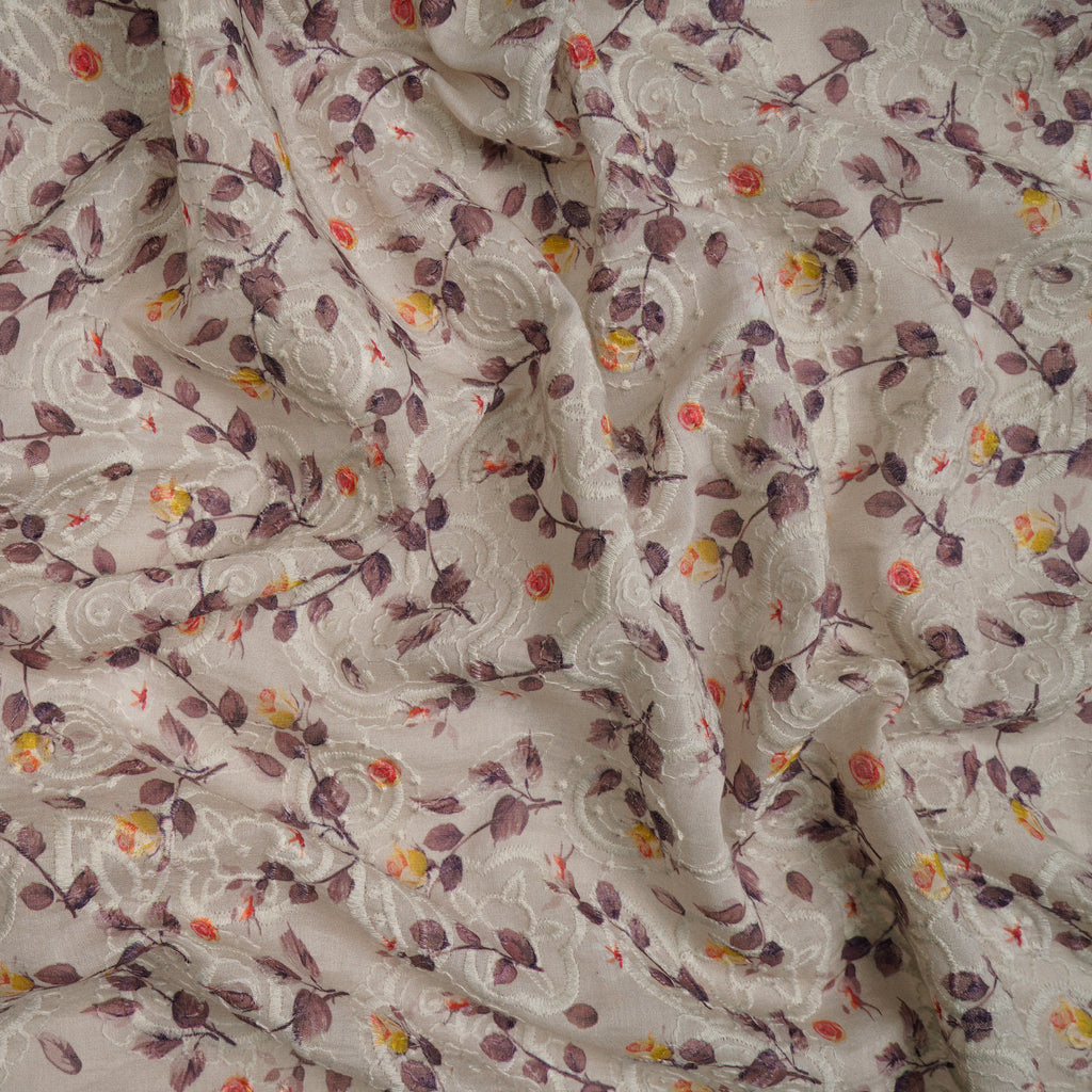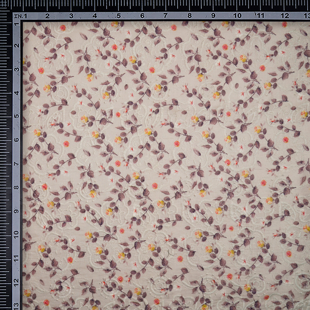 (Pre-Cut 4.40 Mtr)White Floral Pattern Digital Printed Embroidered Pure Chanderi Fabric
