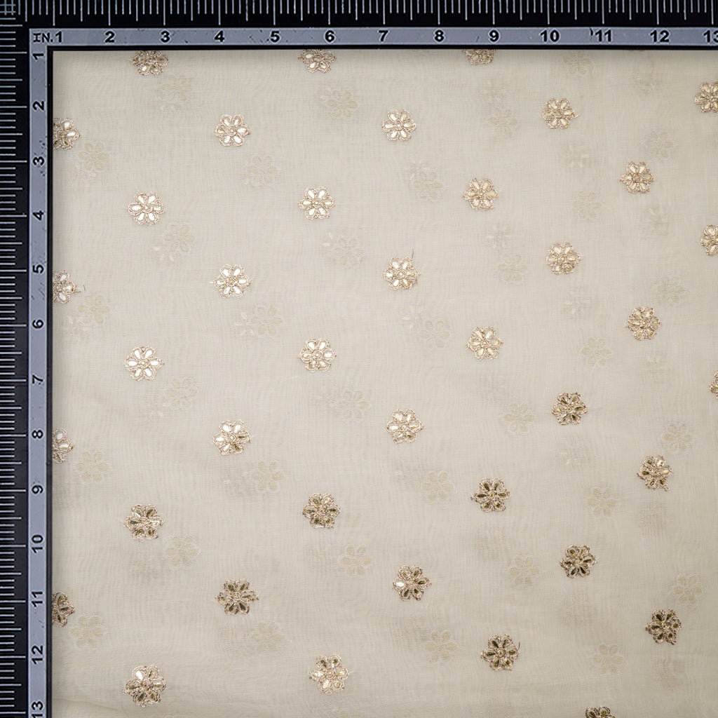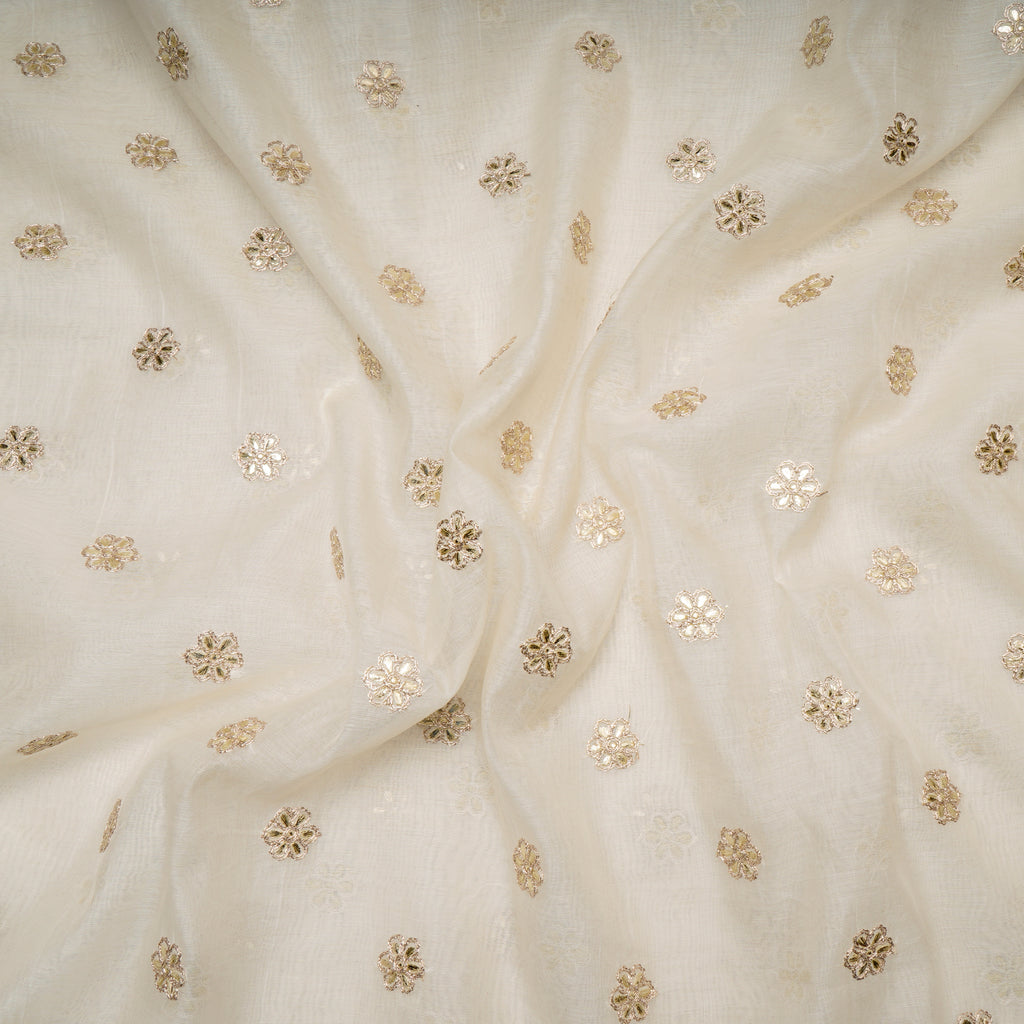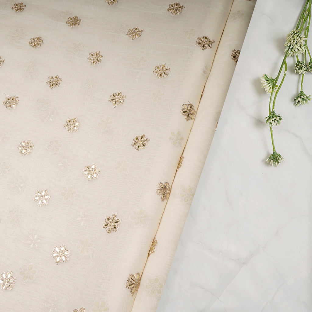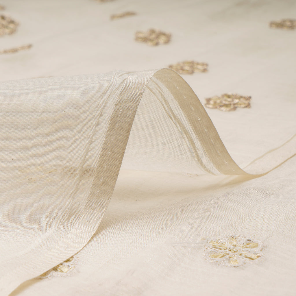 (Pre-Cut 4.70 Mtr)Off-White Motif Pattern Thread Embroidered Chanderi Fabric